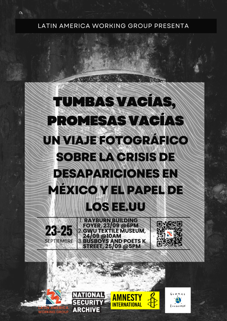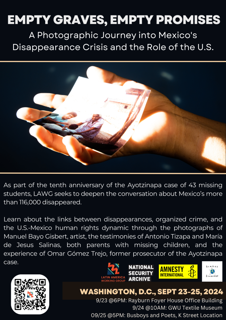Washington, DC – On the week of the tenth anniversary of the most recognized disappearance case in Mexican history, the case of 43 disappeared students in Ayotzinapa, Guerrero, the Latin America Working Group Education Fund (LAWGEF) invites the public to Empty Graves, Empty Promises: A Photographic Journey Into Mexico’s Disappearance Crisis and the Role of the U.S. A photographic tribute to the over 116,000 victims of enforced disappearances in Mexico since 1952, this exhibit tells the story of those disappeared and those tirelessly searching for them.
