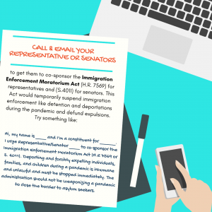 - Say something like: Hi, my name is _____ and I’m a constituent for ______. I urge Representative/Senator ____ to co-sponsor the Immigration Enforcement Moratorium Act (HR. 7569 or S.4011). Deporting and forcibly expelling individuals, families, and children during a pandemic is inhumane and unlawful and must be stopped immediately. The administration is weaponizing a pandemic to close the border to asylum seekers.”