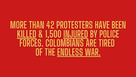 - More than 44 protesters killed & 1,617 injured by police forces. Colombians are tired of the endless war! @Representative, please work with your colleagues and the Colombian government to provide guarantees for Colombians to safely exercise the right to protest #SOSColombia 🕊️